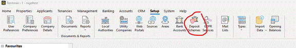 The schemes are represented within Rentman by bank accounts. You can post deposit money from your client account into these (pseudo) accounts to represent you lodging the actual money with the scheme provider.