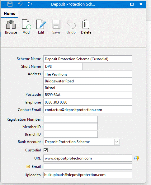 There is a record for each of the deposit schemes. Enter here your agency’s registration id (aka membership number) with each scheme. TDS also has a Member ID and Branch ID that are required for the import (see below); unfortunately you will have to ask TDS what your values are as, at present, they only inform you of your “membership number”. Leave these values blank for other schemes.
