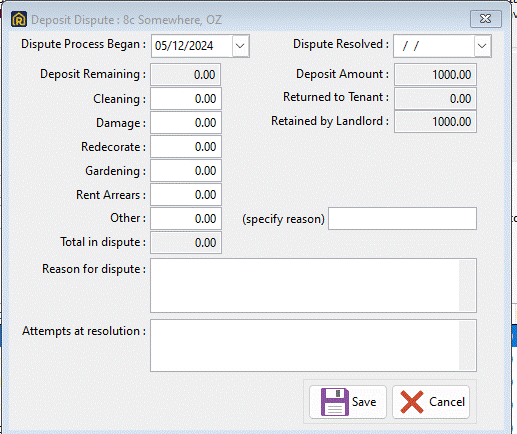 Click the Disputes button on the Deposits screen in Rentman. A new screen appears for you to enter details of the dispute.