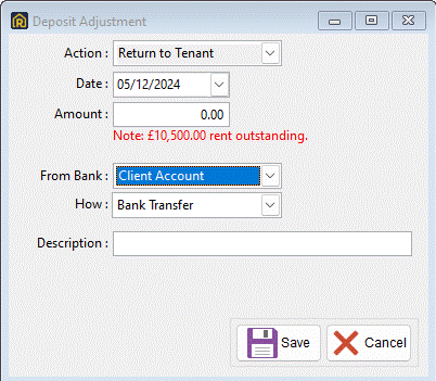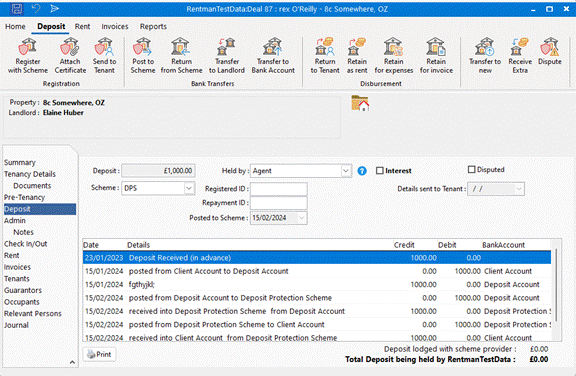 It is also from here that you register the deposit with the schemes, send details to the tenant, post between accounts and retain against rent, expenses or invoices.